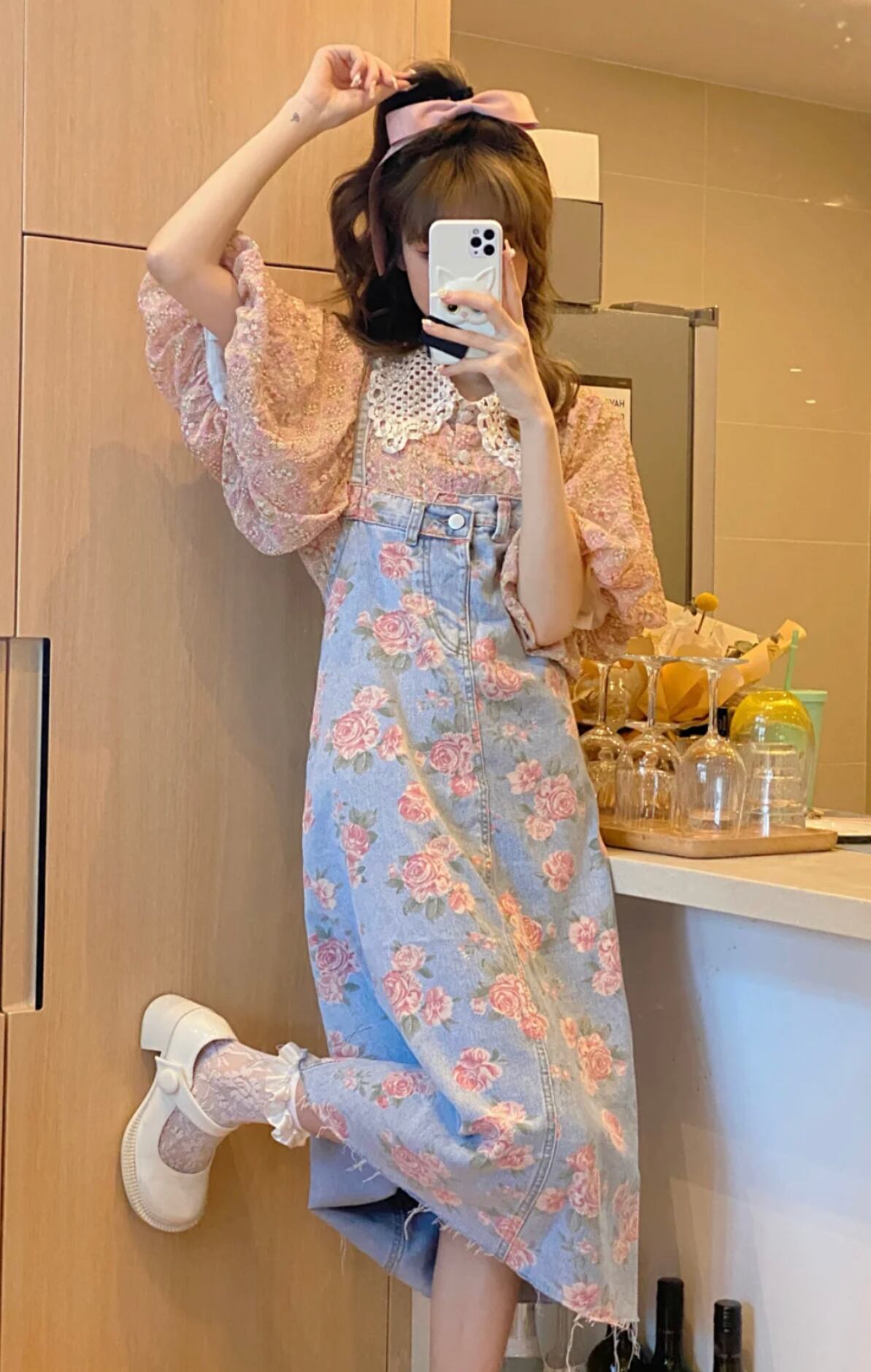 色:ピンクのワンピース,フラワーサスペンダースカートワンピース