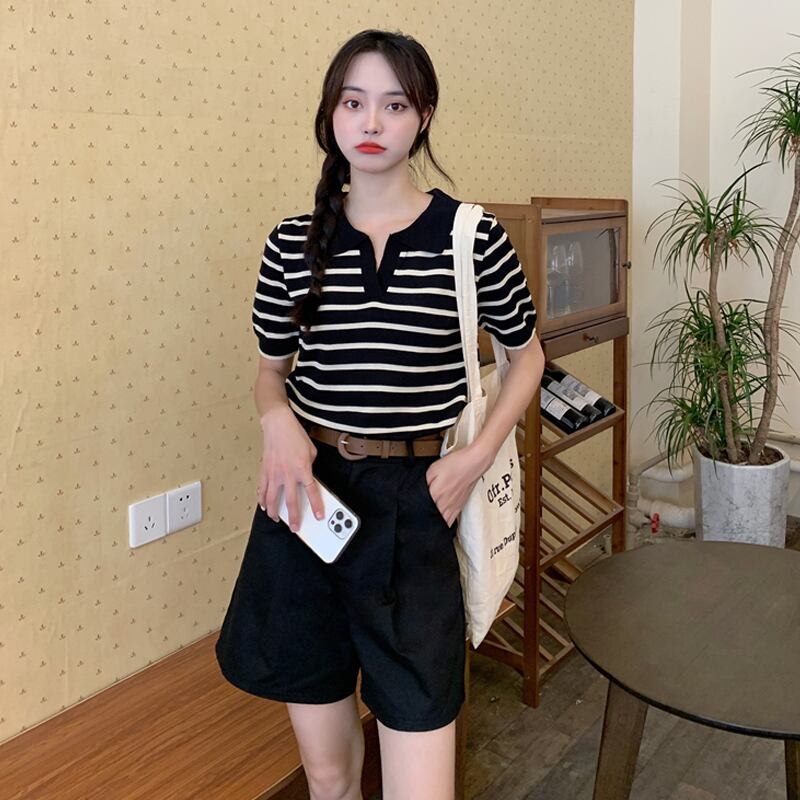色:シングルアプリコットストライプTシャツ,シングルブラックストライプTシャツ,単一のベルトを送るための黒いズボン,ベルト付きアプリコットパンツ