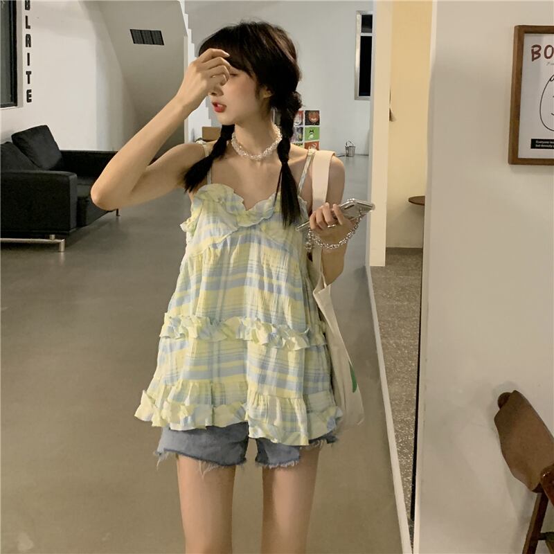 Vネック格子柄サマースタイルノースリーブバック 夏物 試着室17092873614