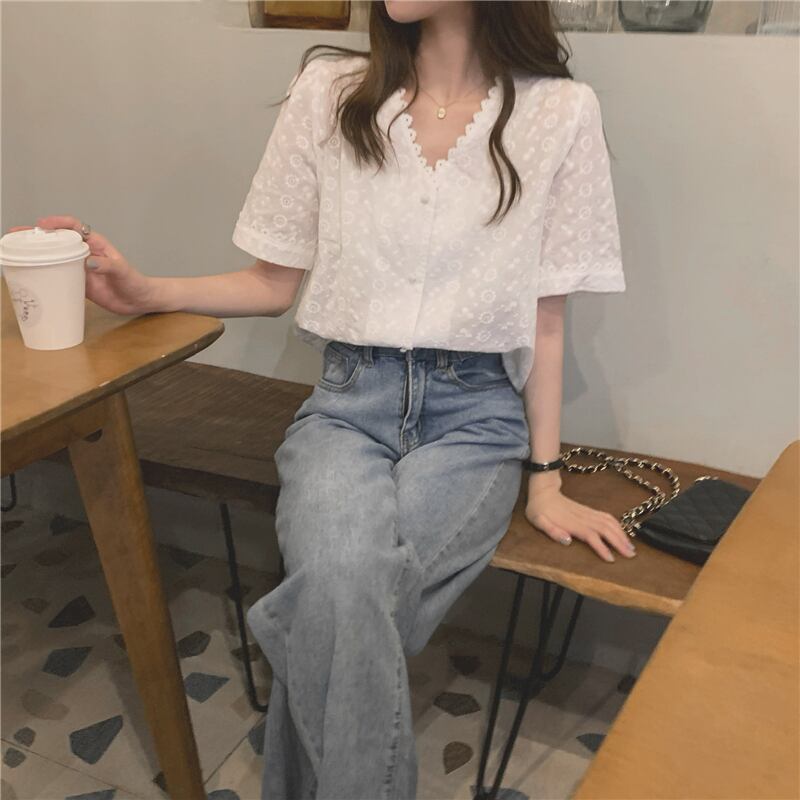 レースブラウス サマースタイルVネックシャツ 夏物 試着室25371386036