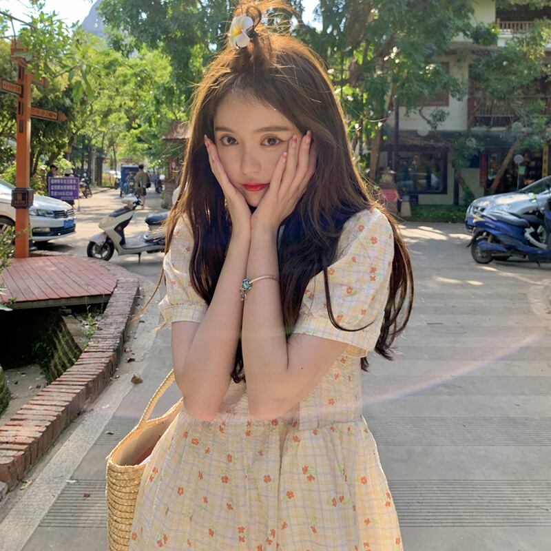 スリーブ格子柄ドレス サマーカラーロングスカート 大人ガーリー スウィート キュート カジュアル 夏物 試着室4523687111