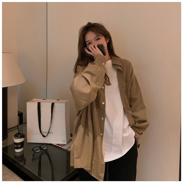格子柄シャツ ジャケット レディーススタンダードスタイルスプリングオータムルーズトップス ロング レトロ 春物 秋物 試着室11960333593