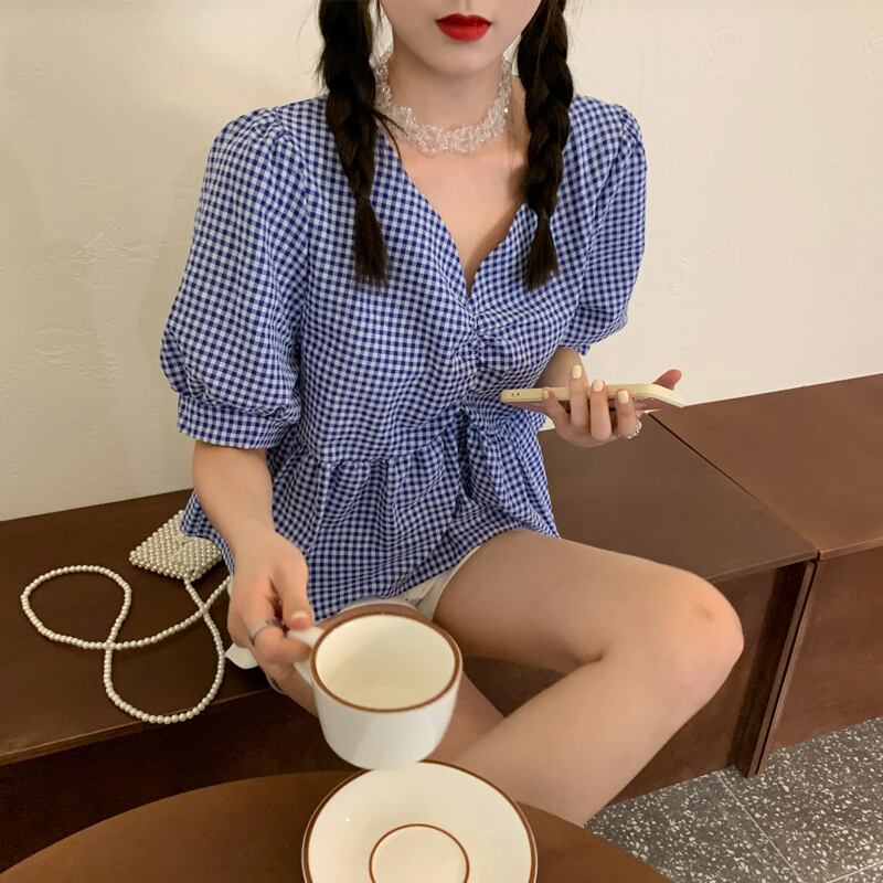ブラック格子柄スリーブシャツ サマーVネックドレス 夏物 試着室55612554553