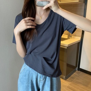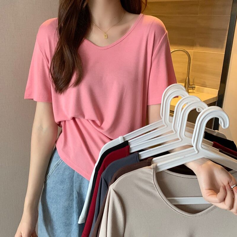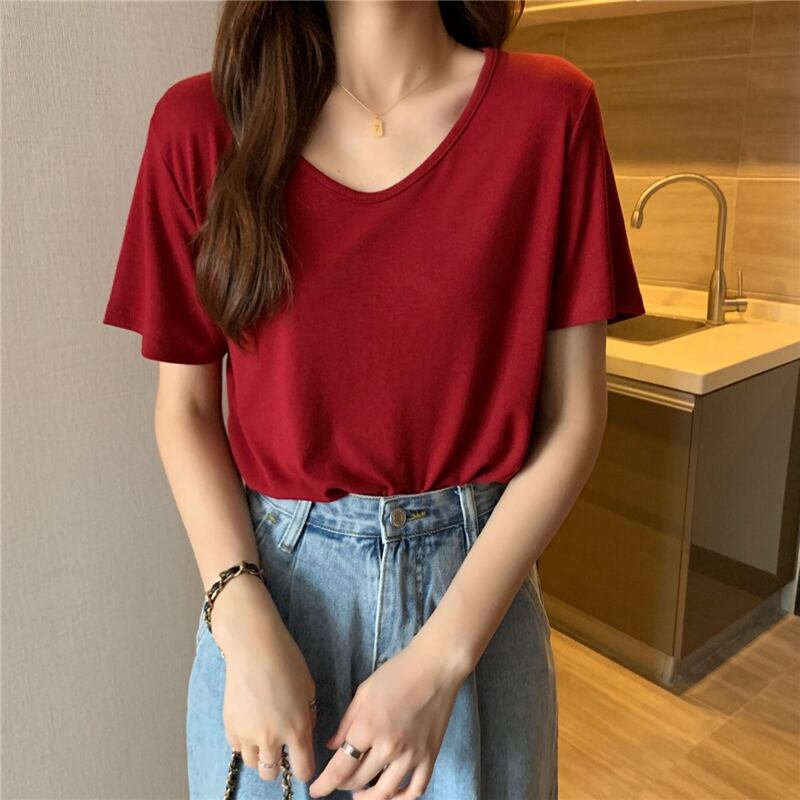 カラーTシャツ サマーレッドルーズVネックトップス 夏物 試着室13824341542