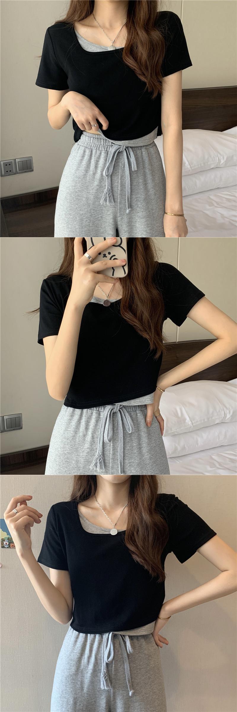 グレーショートTシャツ サマーハイウェストトップス 夏物 試着室99297585627