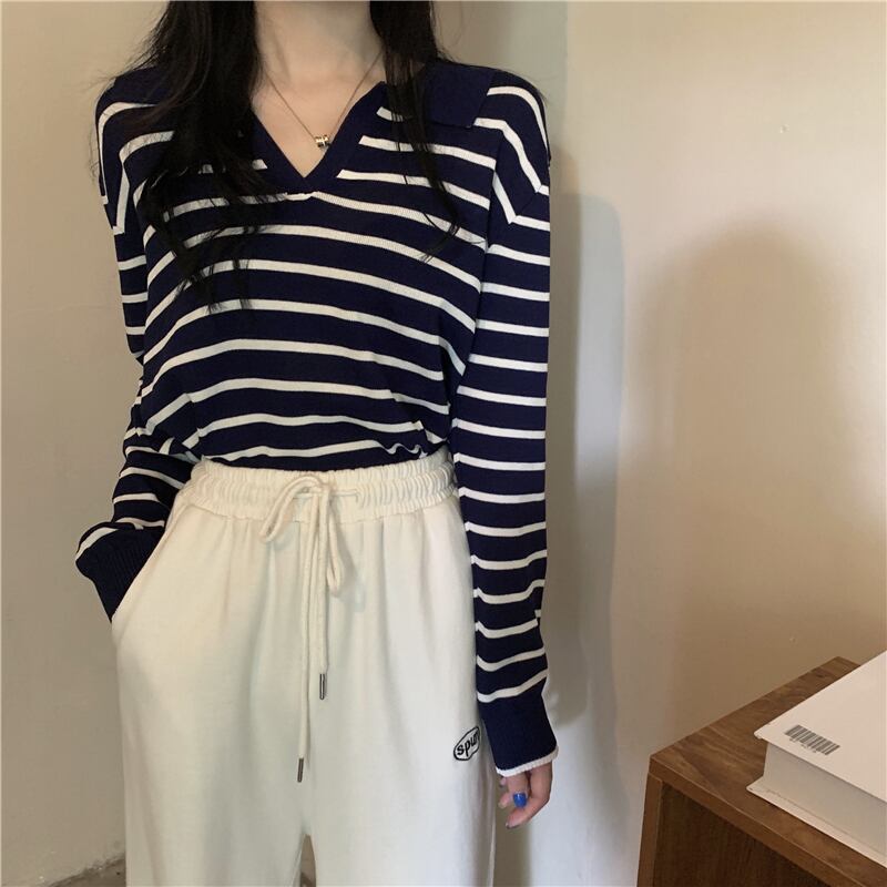 ストライプTシャツ シャツ スプリングオータムVネックショートトップス ロング 春物 秋物 試着室7214378611