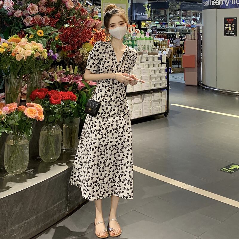 Vネックフローラルドレス サマー薄手スタンダードスリムロングスカート レトロ 夏物 花柄 試着室25772298492