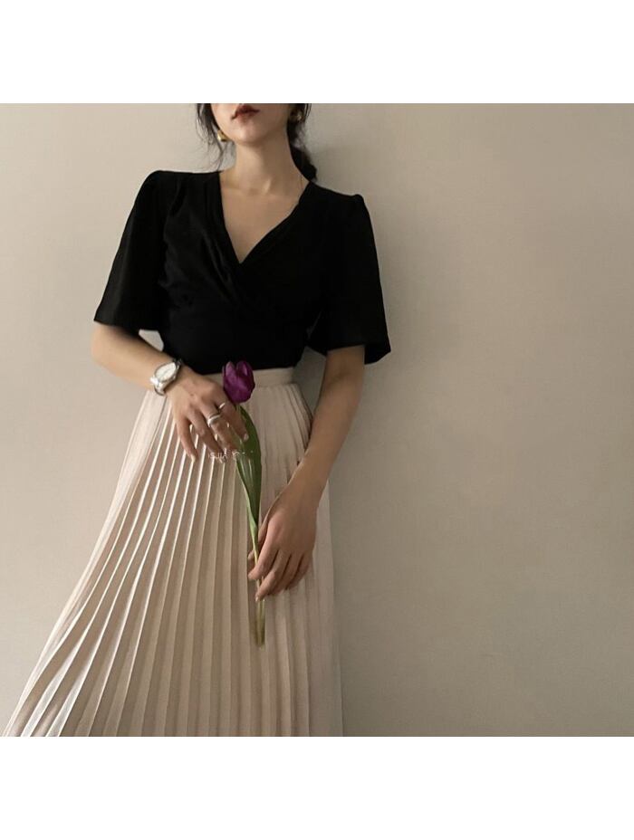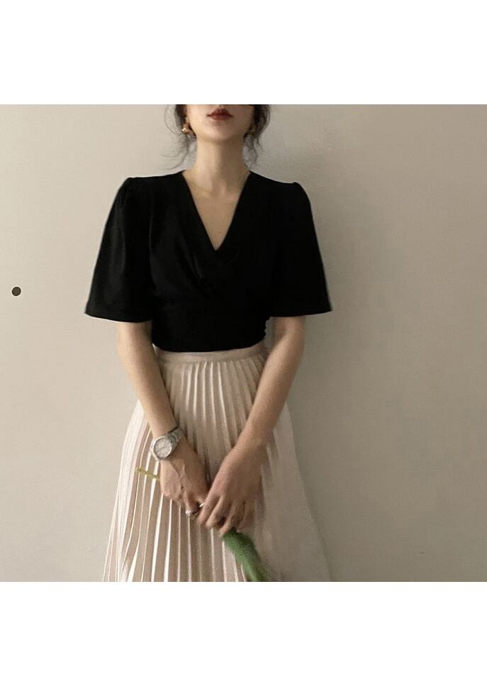 ブラックVネックショートTシャツ サマースタイル 夏物 試着室23128642835