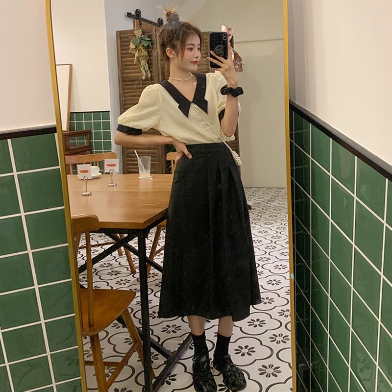 色:ワンピースアプリコットシャツ,黒スカートワンピース