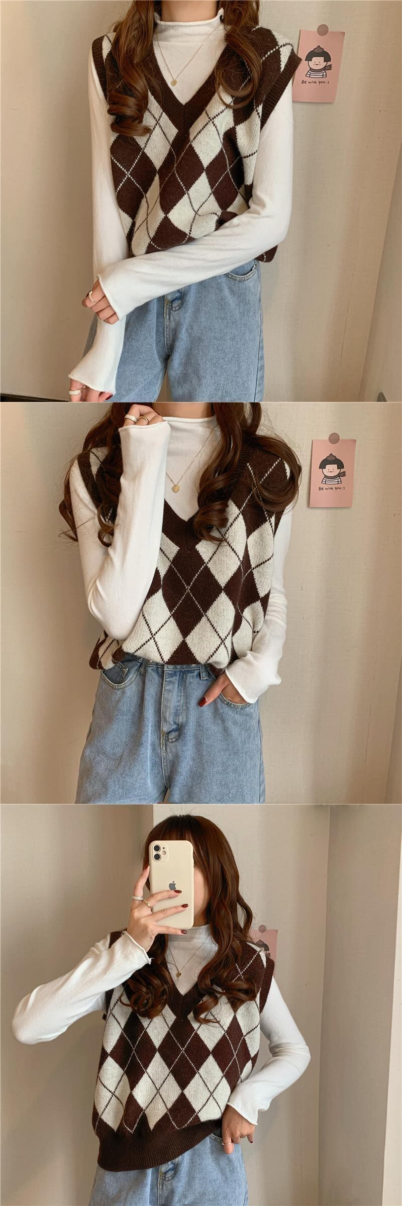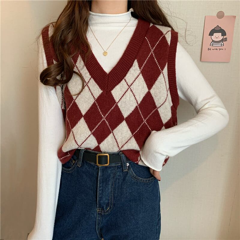 Vネックニットルーズスプリングオータムスタイルノースリーブ レッド 春物 秋物 試着室5979066485
