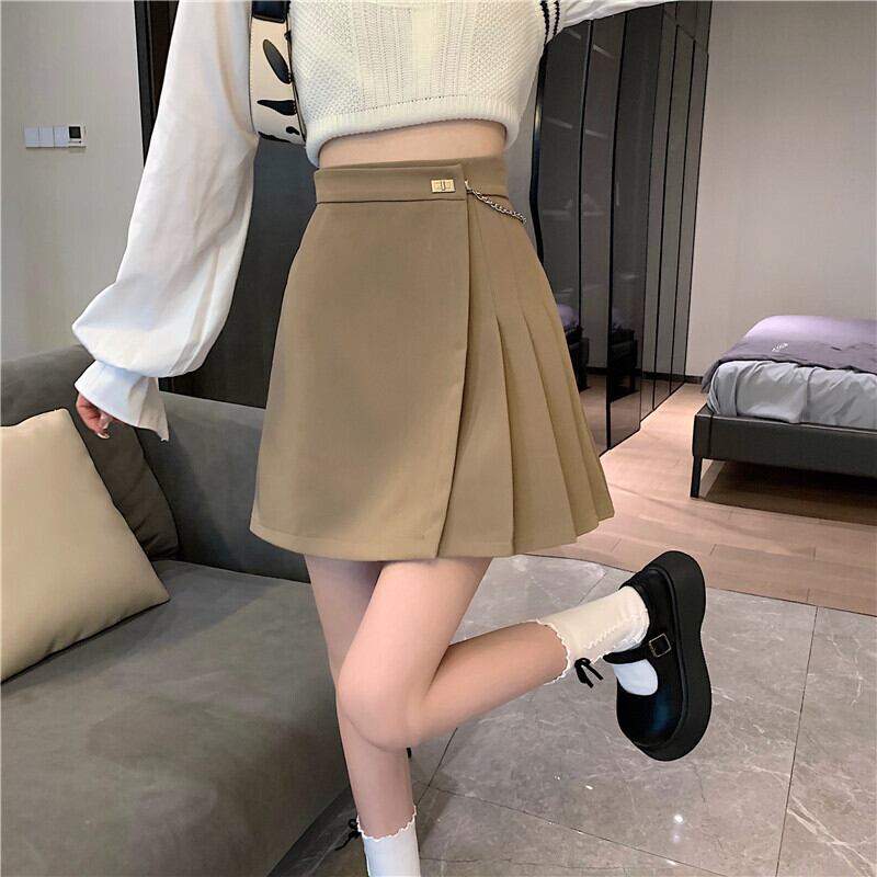 ブラックプリーツスカート スプリングオータムハイウェストウェストAラインショート 春物 秋物 試着室15591653374