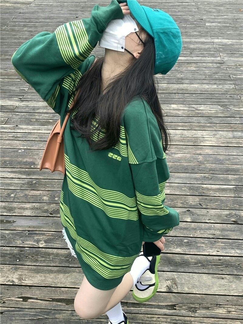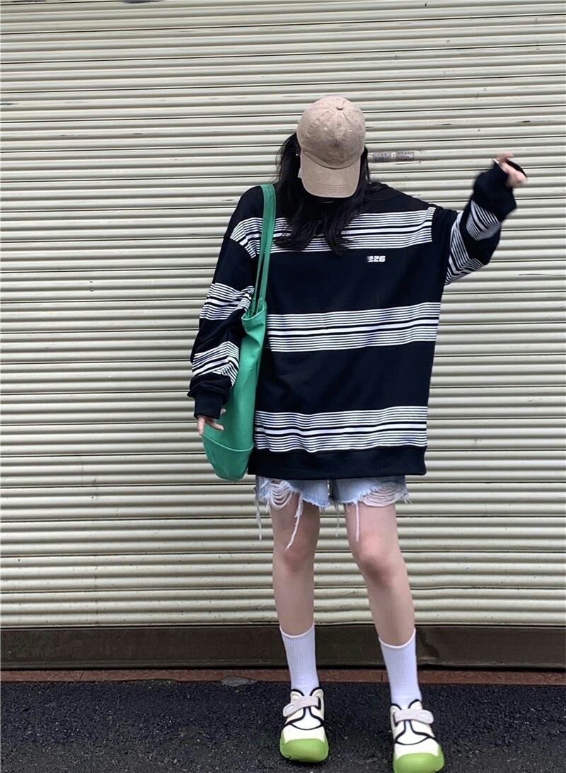 ストライプラウンドネックスウェット スプリングオータムスタイルルーズ ストリート 春物 秋物 Oネック 試着室12113152791