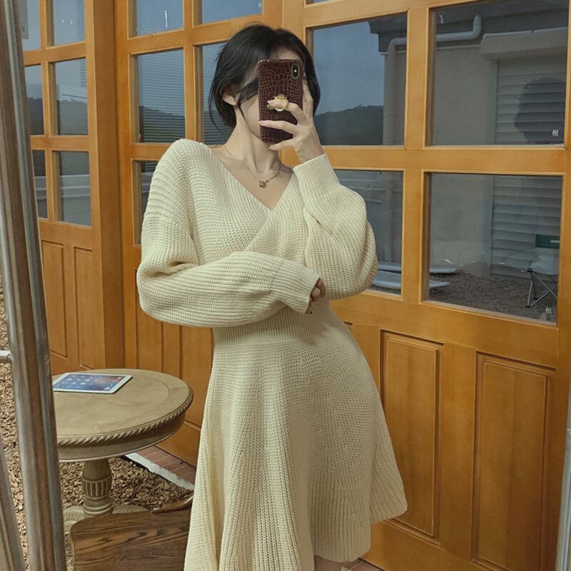 Vネックウェストニットドレス スプリングオータムショートスカート 春物 秋物 試着室66544682361