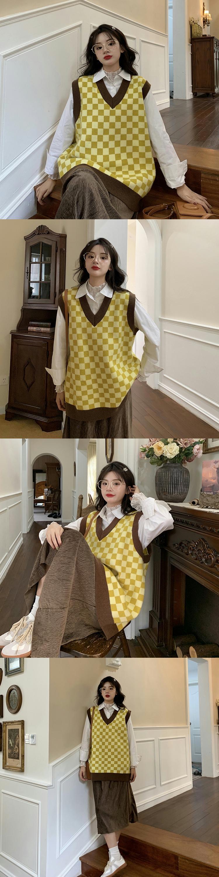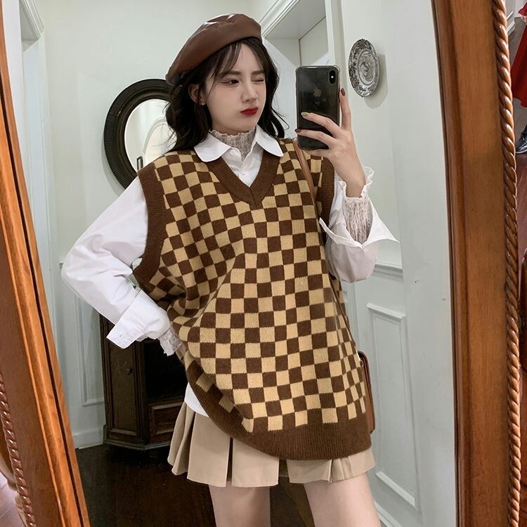 格子柄ニットスプリングオータムセーター レッド 春物 秋物 試着室10289641870