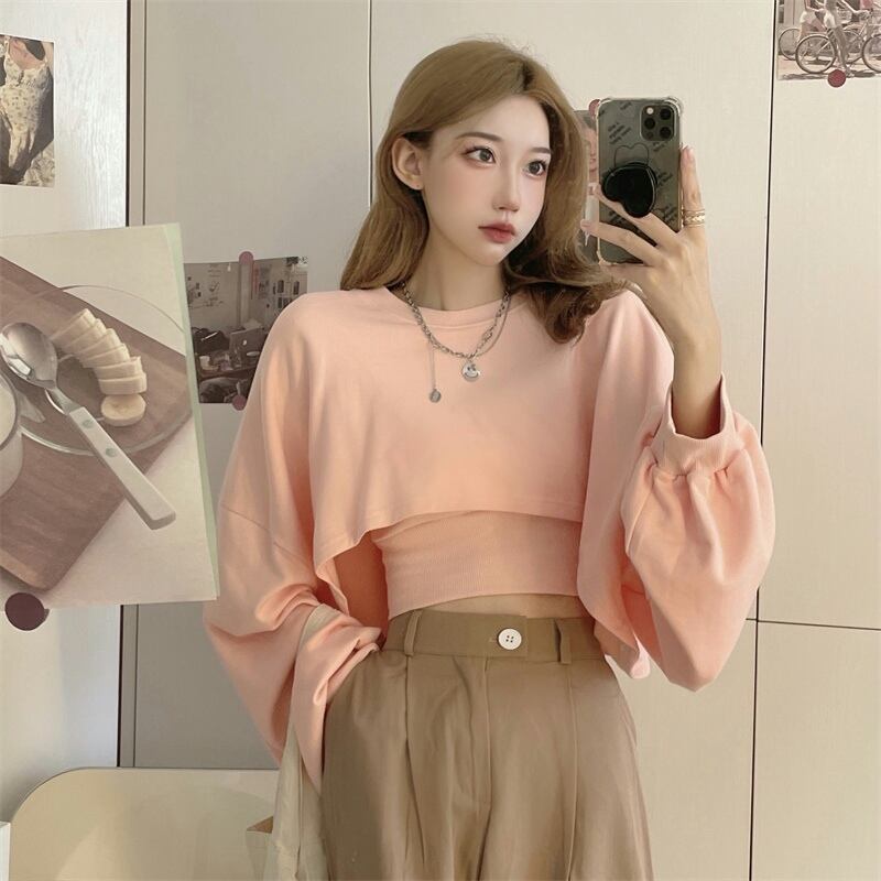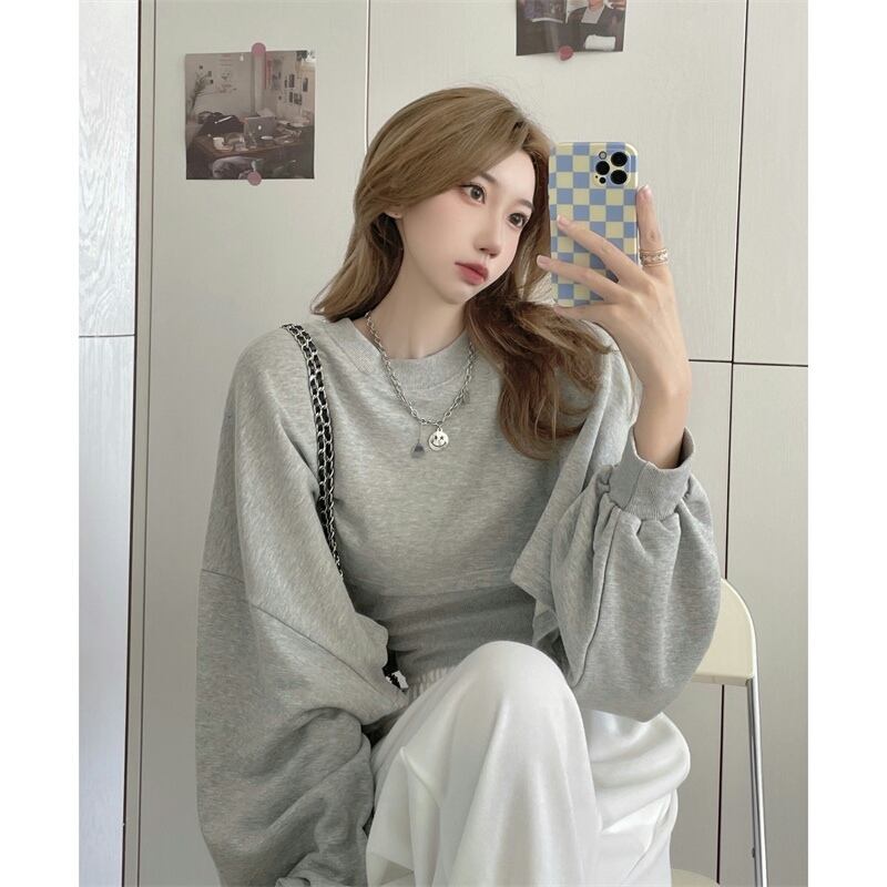 ラウンドネックセーター スプリングオータムブラウス ショートトップス ドレス ピンク 大人ガーリー スウィート キュート カジュアル 春物 秋物 Oネック 試着室49147626735