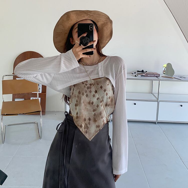スプリングオータムスカーフ トップス ショート 春物 秋物 スクウェア 試着室81973314079