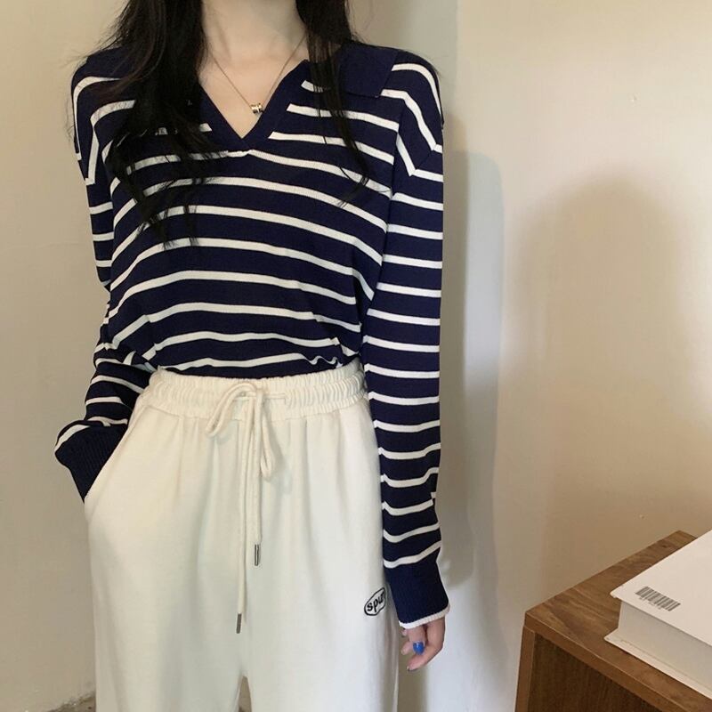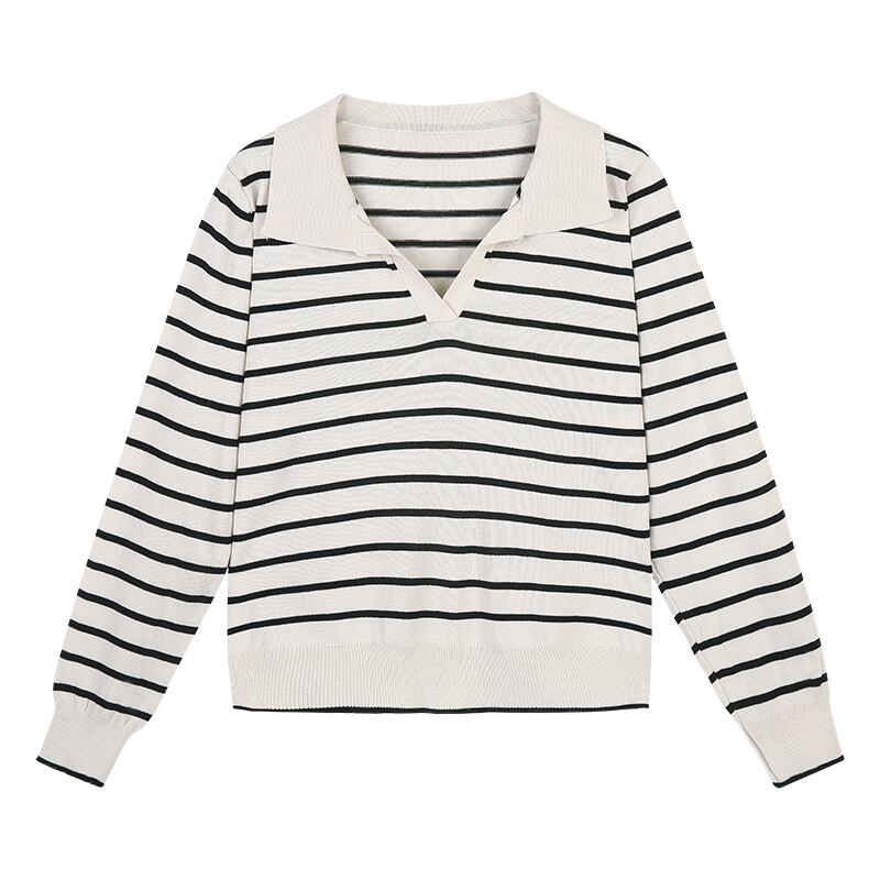 ストライプニットセーター スプリングオータム薄手Vネックトップス 春物 秋物 シルク 試着室13793079692