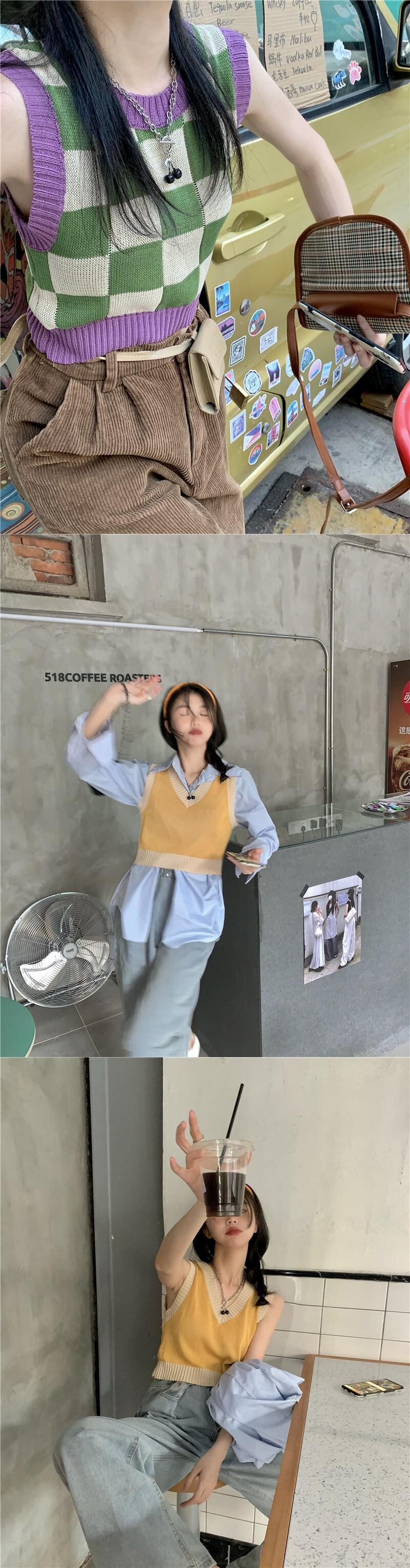 格子柄ニットサマートップス ノースリーブショート 夏物 試着室85482647497
