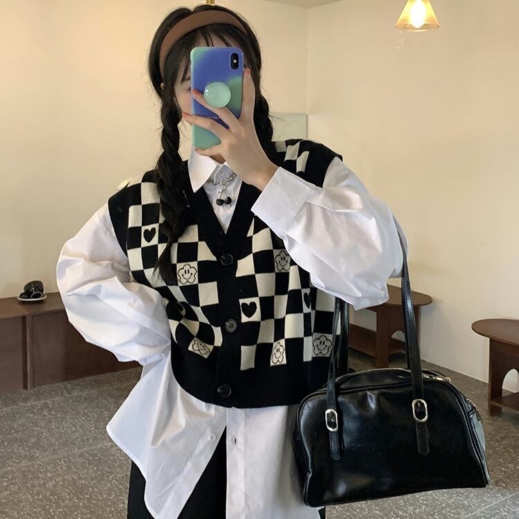格子柄ニットスプリングオータムスタイルショートセーター 春物 秋物 試着室83037769529
