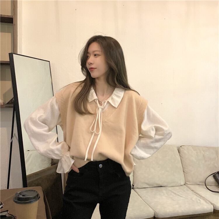 色:カーキベストワンピース,オフホワイトシャツシングル