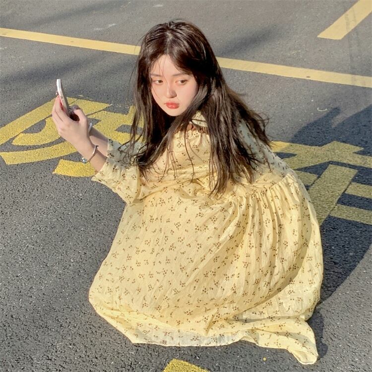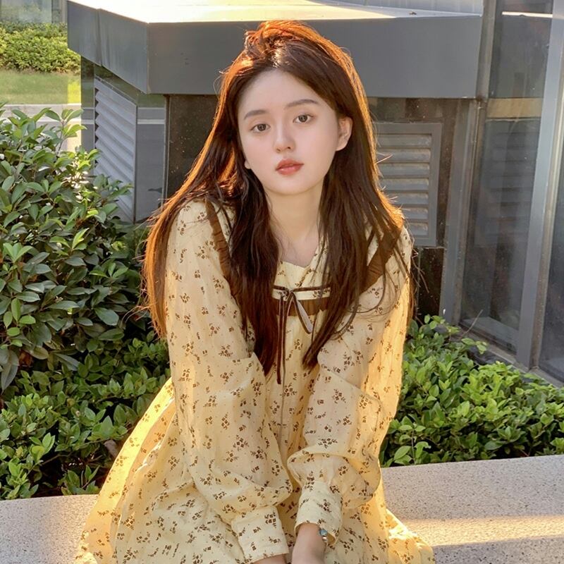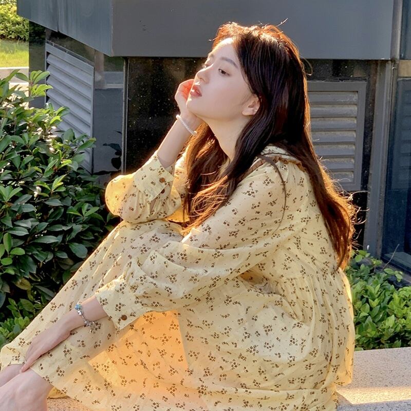 イエローロングフローラルドレス スプリングオータムスタイルスカート 春物 秋物 花柄 試着室89968103591