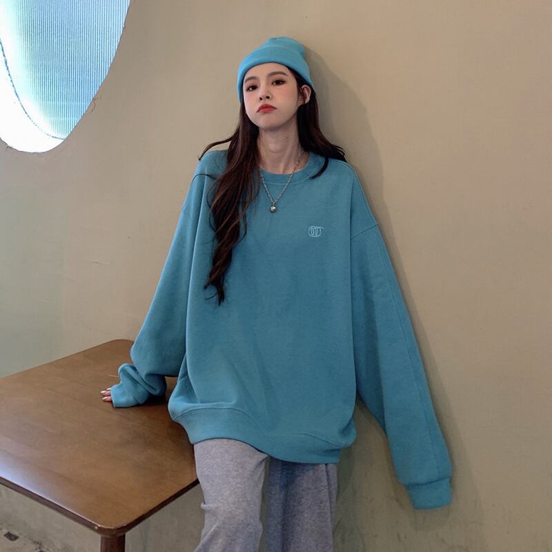 ブルーラウンドネックセーター スプリングオータム薄手ルーズシャツ ロング 春物 秋物 Oネック 試着室47983794765