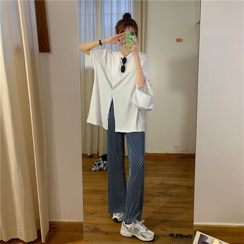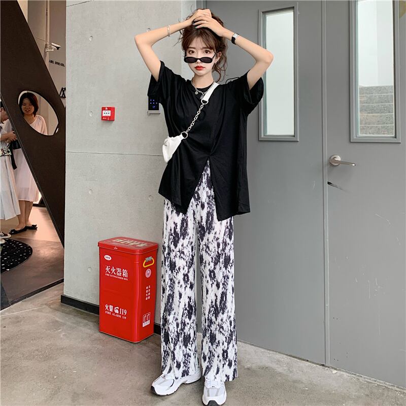 色:黒のTシャツシングルピース,ホワイトTシャツシングルピース,黒のワイドレッグパンツ,ブルーワイドレッグパンツワンピース