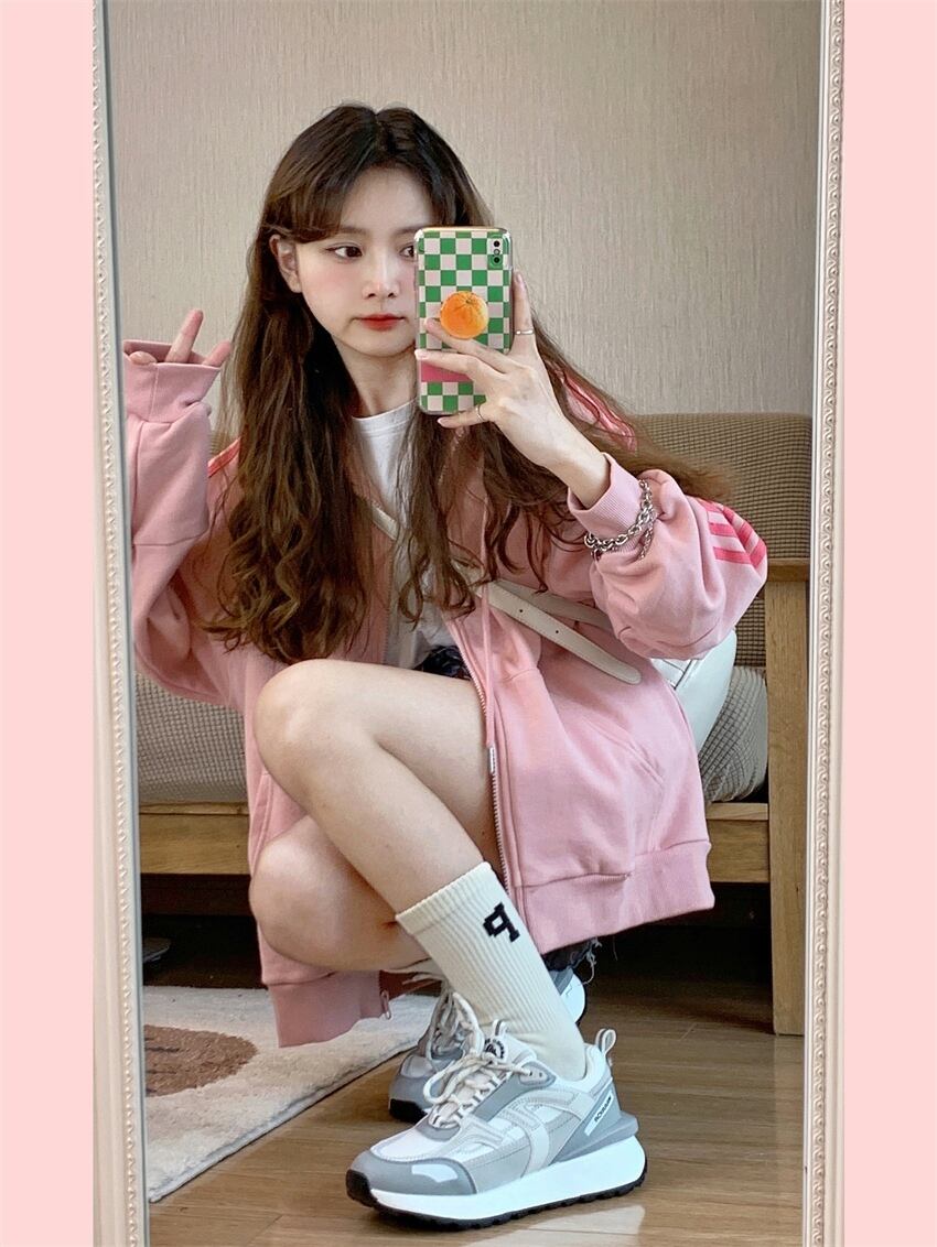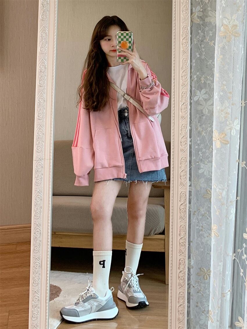 フードセーター コート スプリングオータムルーズ ピンク 春物 秋物 試着室60475151923