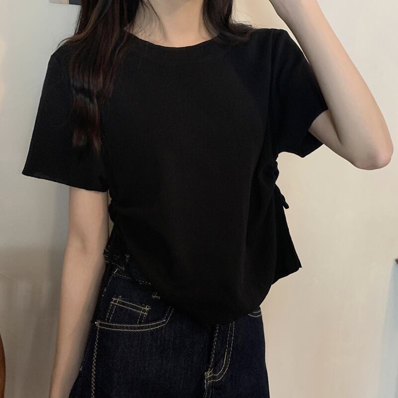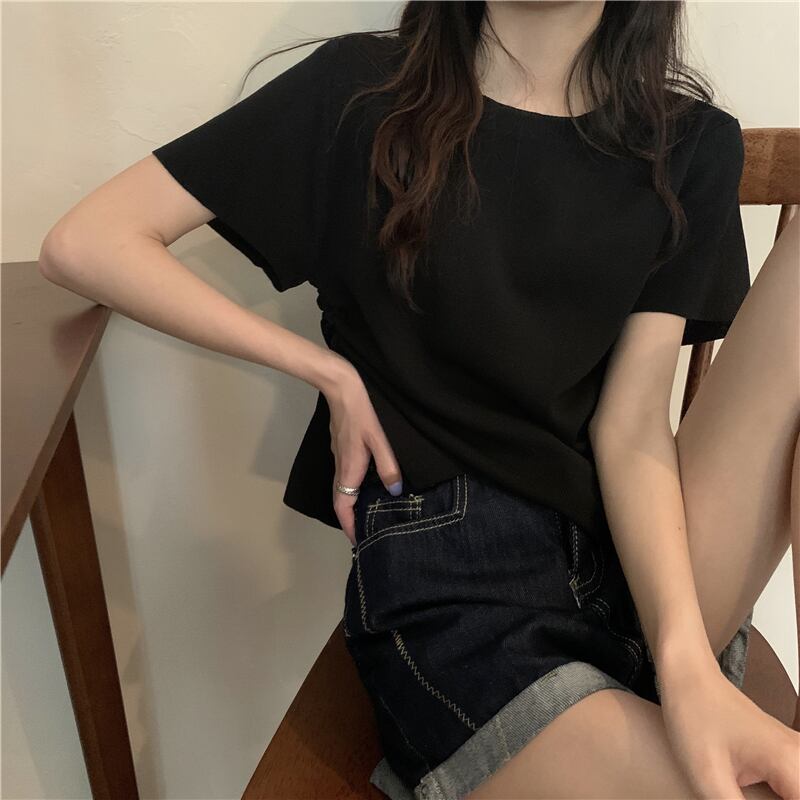 ホワイトニットショートTシャツ サマーギャザー 夏物 試着室37917851908