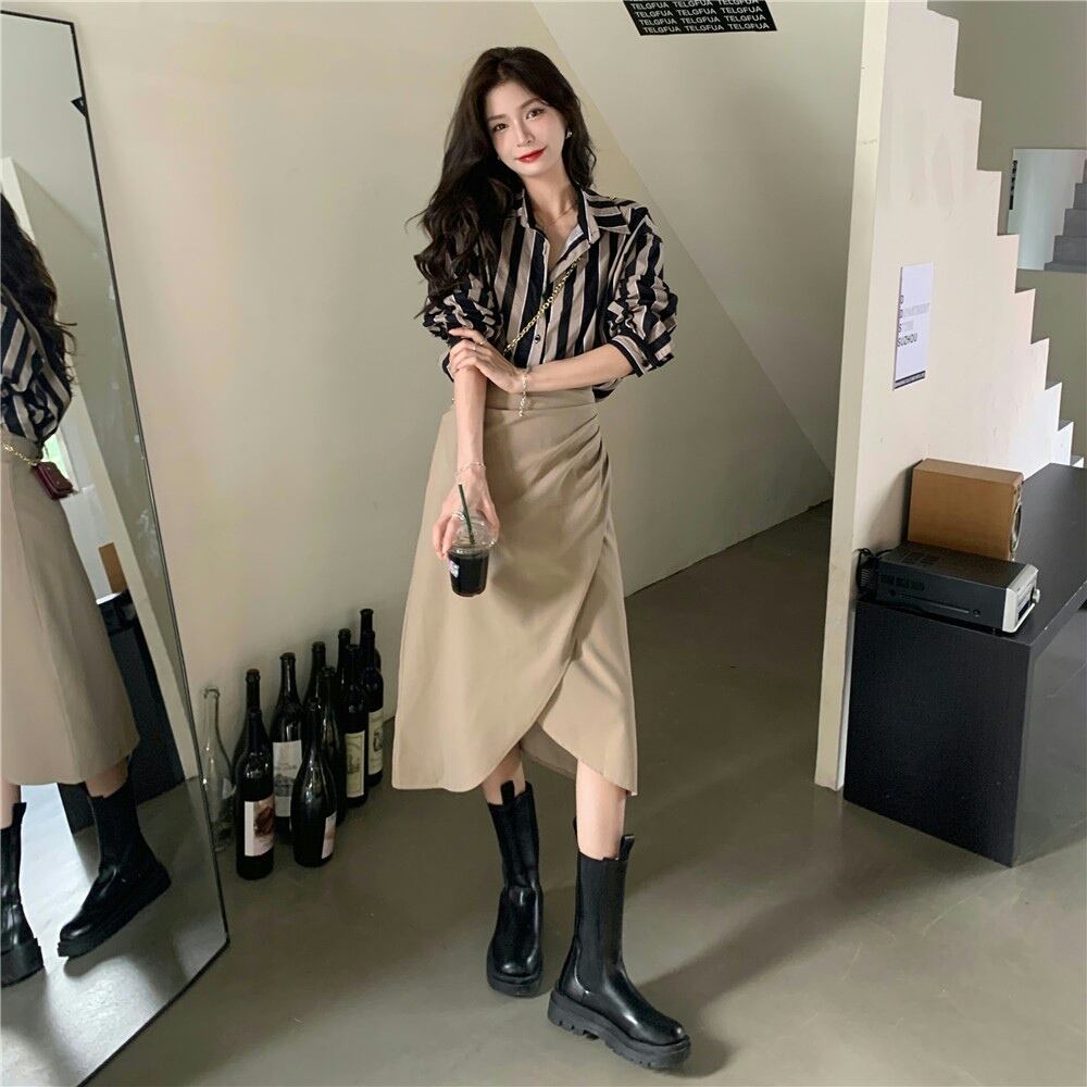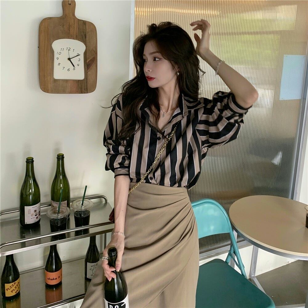 色:コーヒーカラーハーフスカートワンピース,ストライプシャツシングル