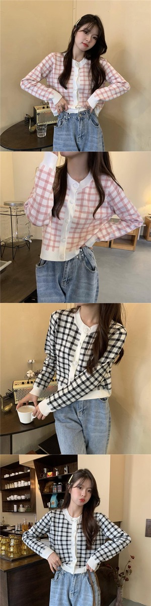 格子柄ニット スプリングオータムカーディガンセーター ジャケット ショートトップス 春物 秋物 試着室36069722263