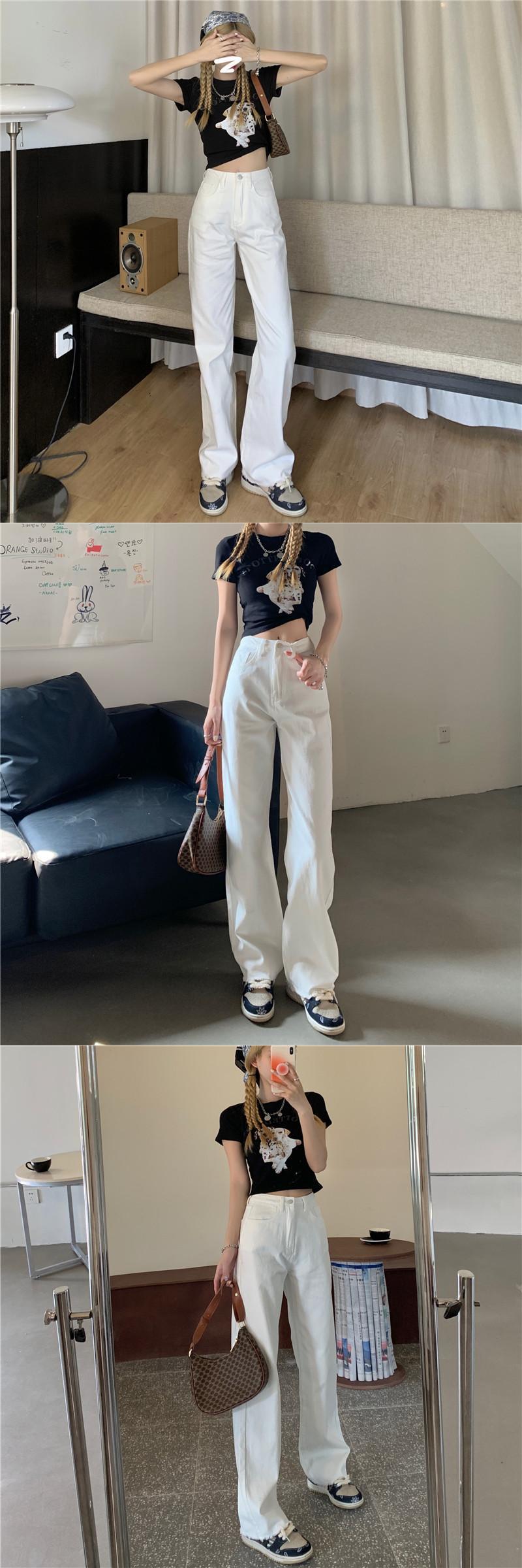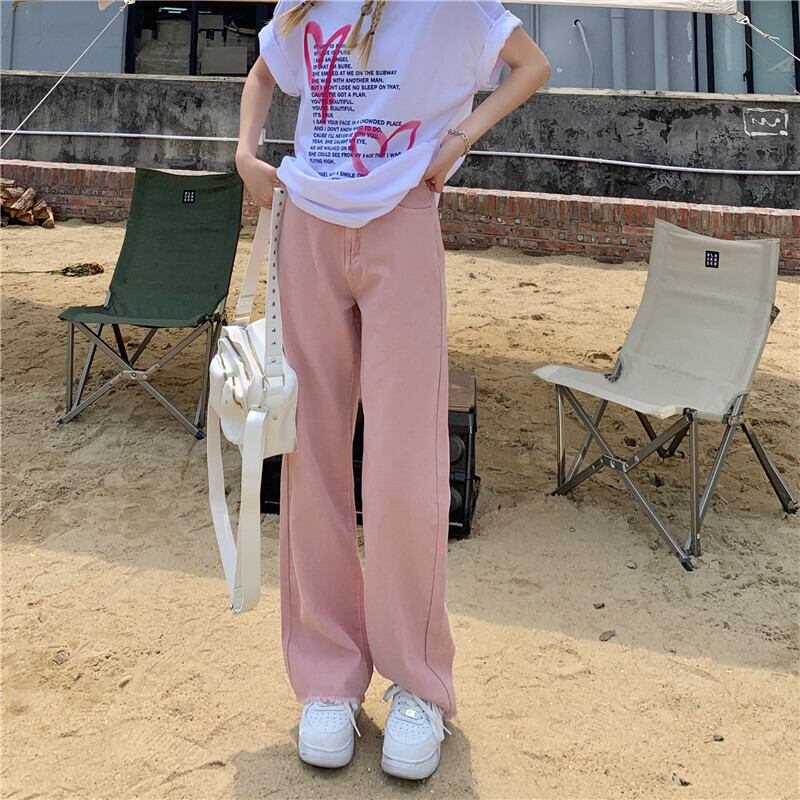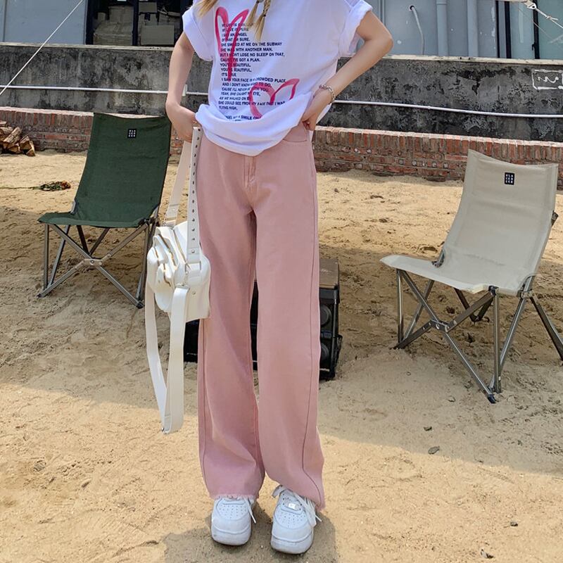 ジーンズ ルーズスプリングオータム薄手ハイウェストウェストワイドレッグパンツ ピンク 春物 秋物 ワイドパンツ 試着室55585670150