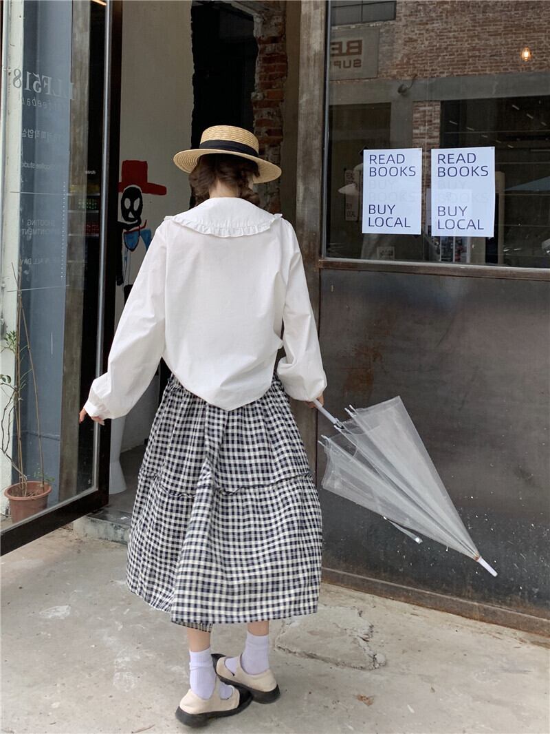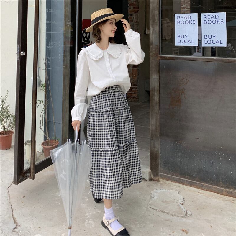 色:白いシャツのワンピース,格子縞のスカートのシングルピース