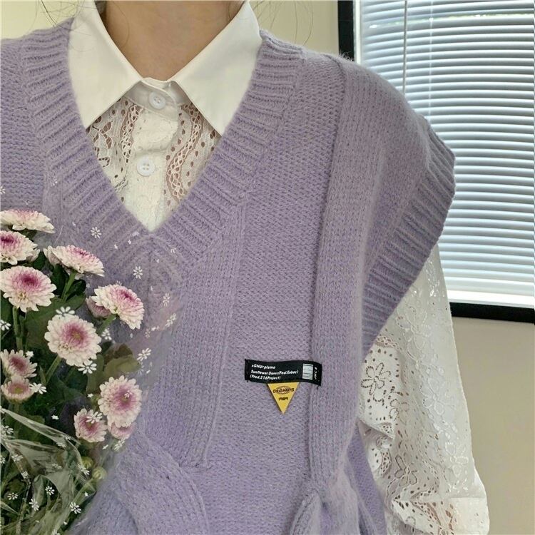 Vネックニットスプリングオータムセーター 春物 秋物 パープル 試着室55019357206