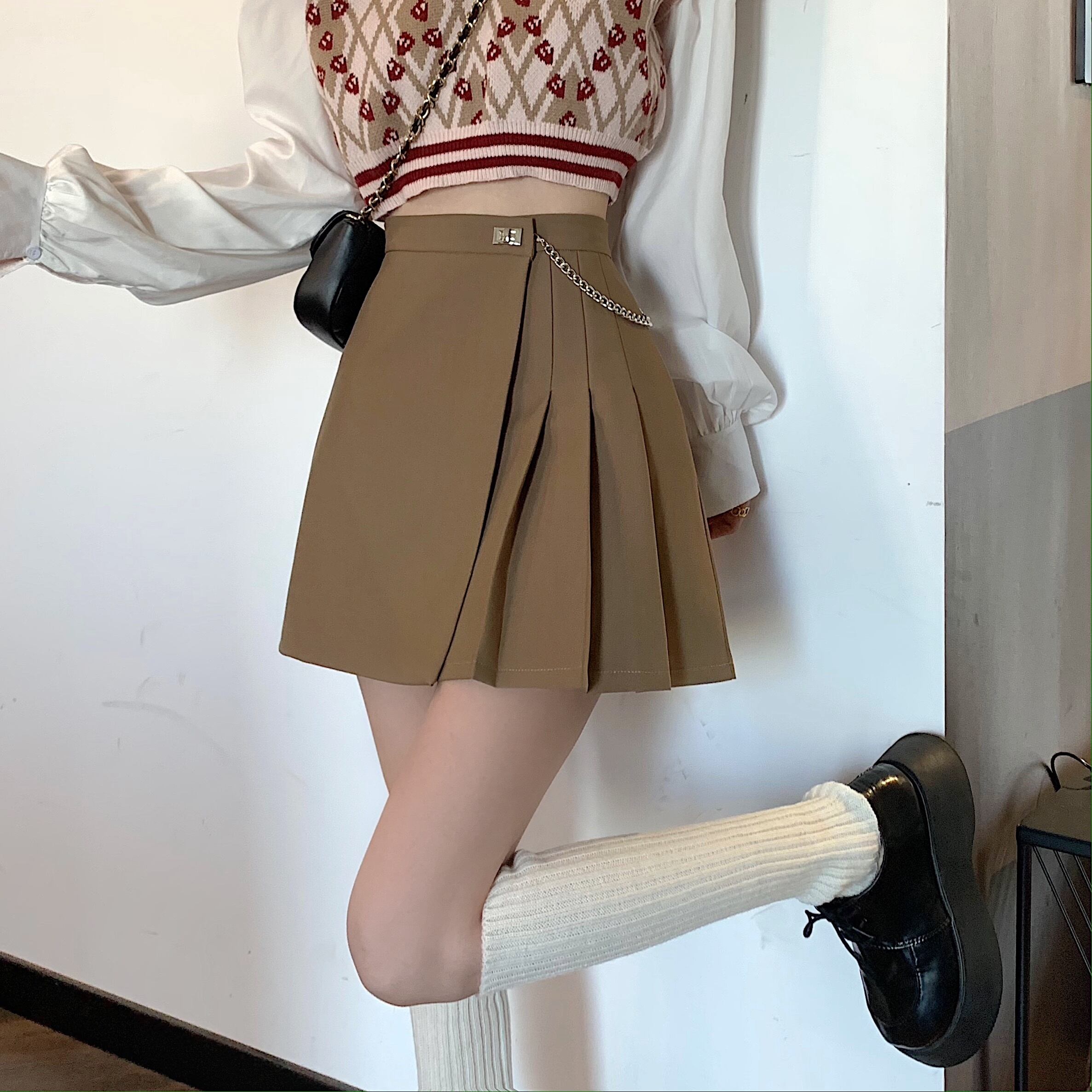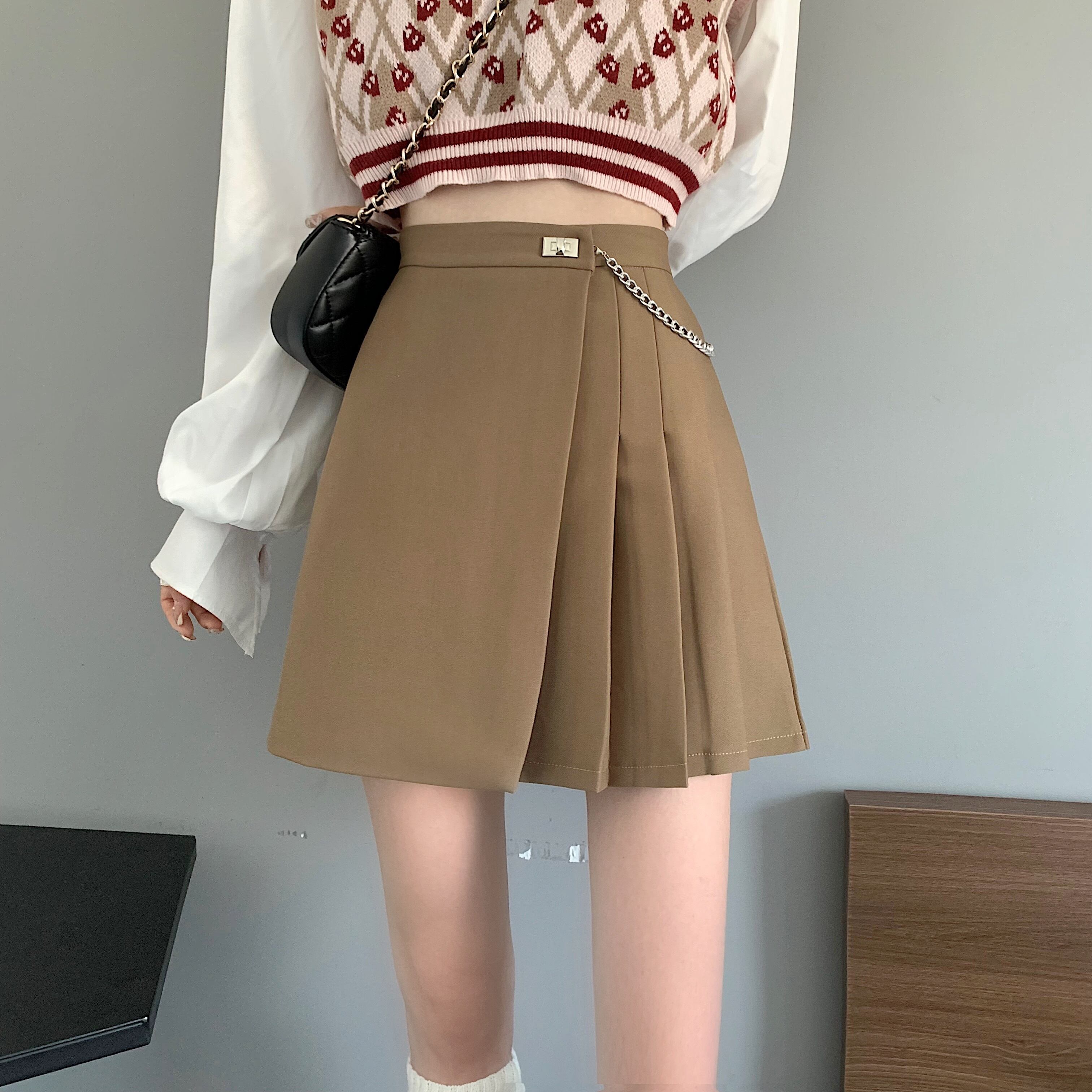 ブラックプリーツスカート スプリングオータムハイウェストウェストAラインショート 大人ガーリー スウィート キュート カジュアル 春物 秋物 試着室74661018325