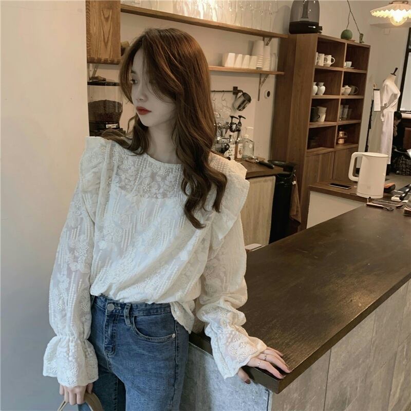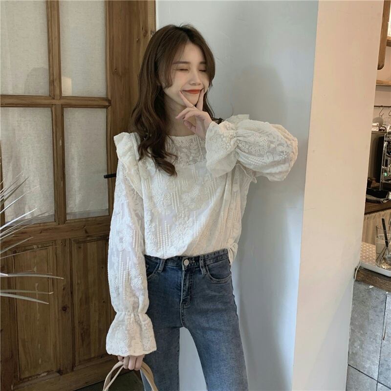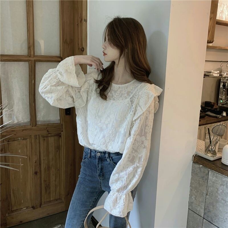 ホワイトレースシャツ スプリングオータムスタイル ロング 春物 秋物 試着室95406446182