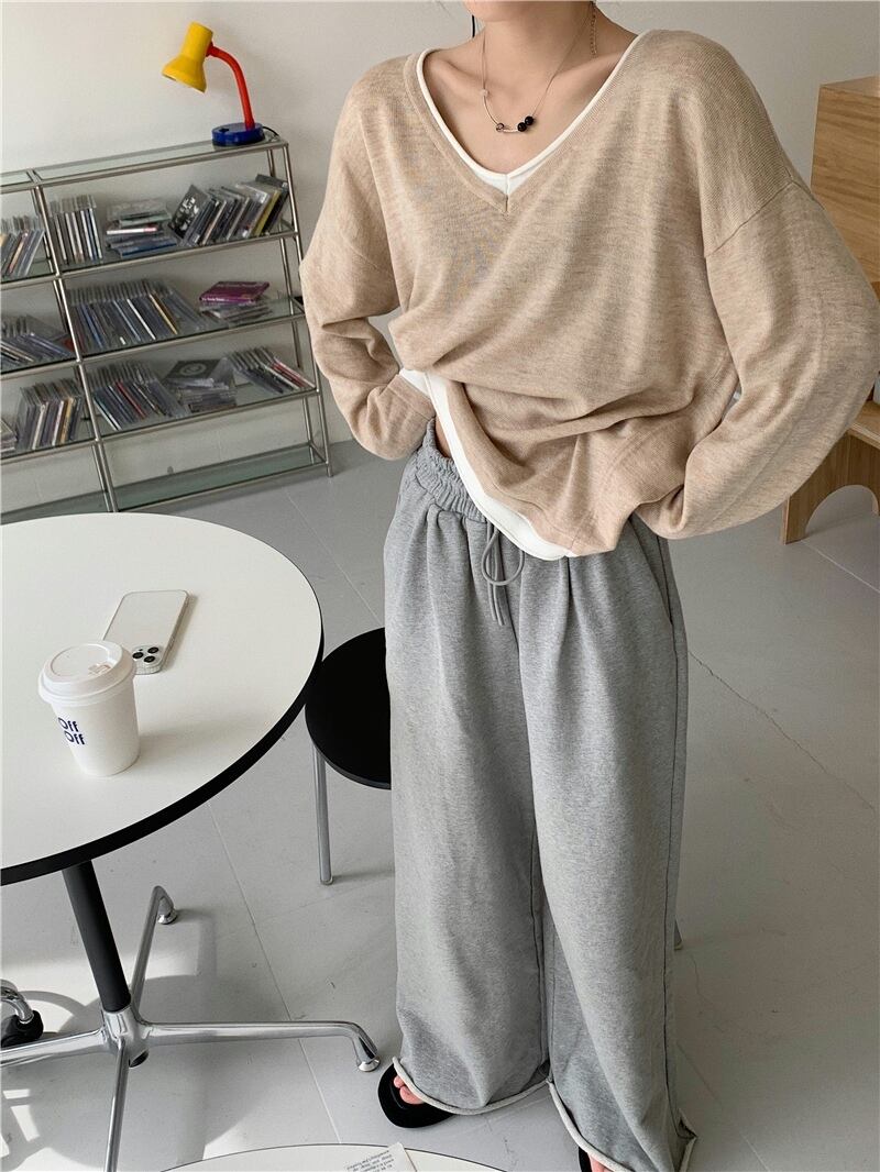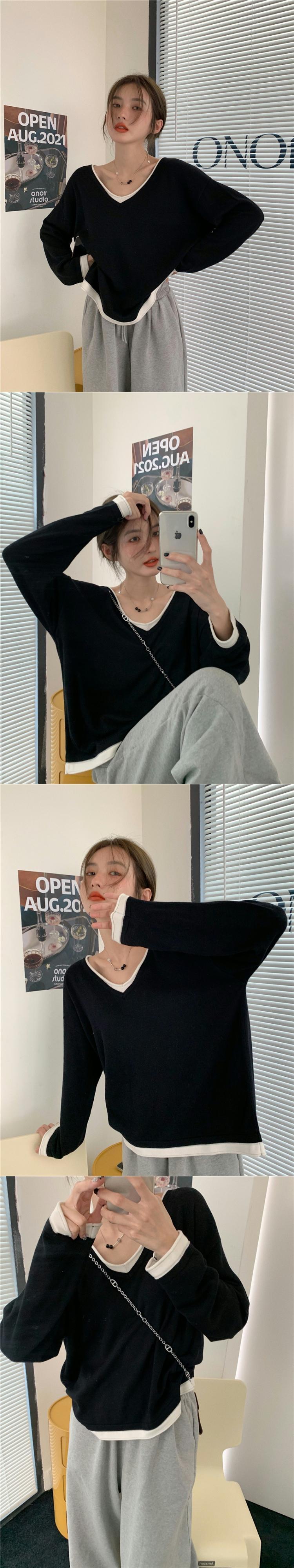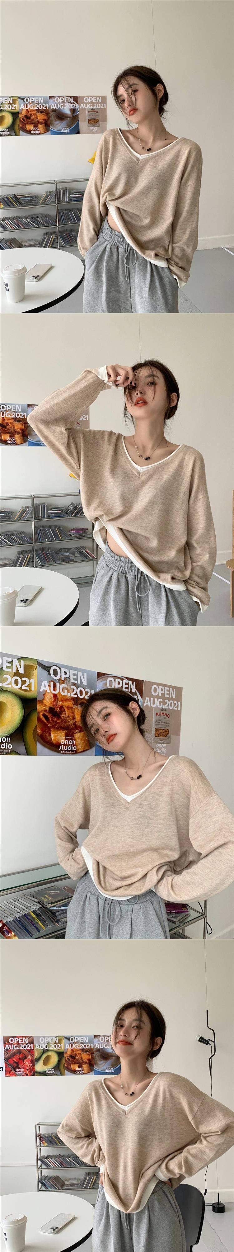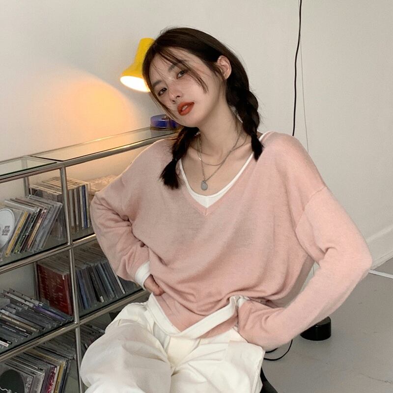 セーター スプリングオータムスタイルルーズVネックブラウス ピンク 春物 秋物 試着室43724976068