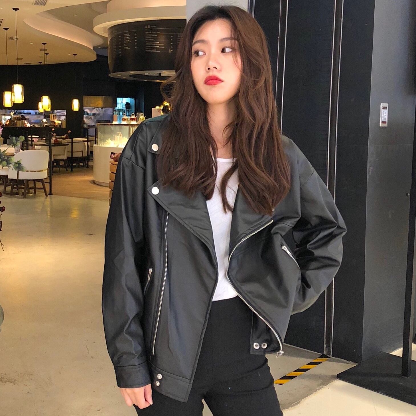 ブラックレザージャケット スプリングオータムスタイルルーズ 春物 秋物 試着室31786578169