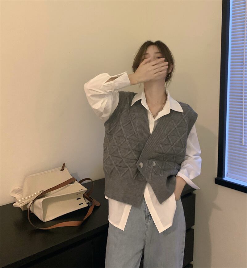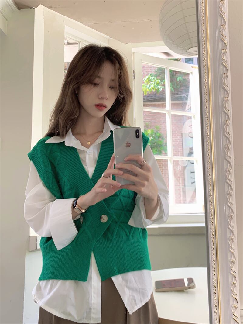色:白いシャツのワンピース,グリーンベストワンピース,グレーベストシングルピース,コーヒーカラーベストワンピース
