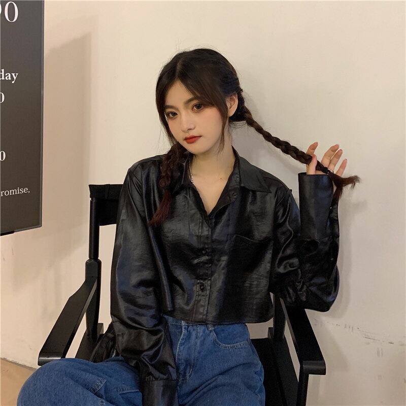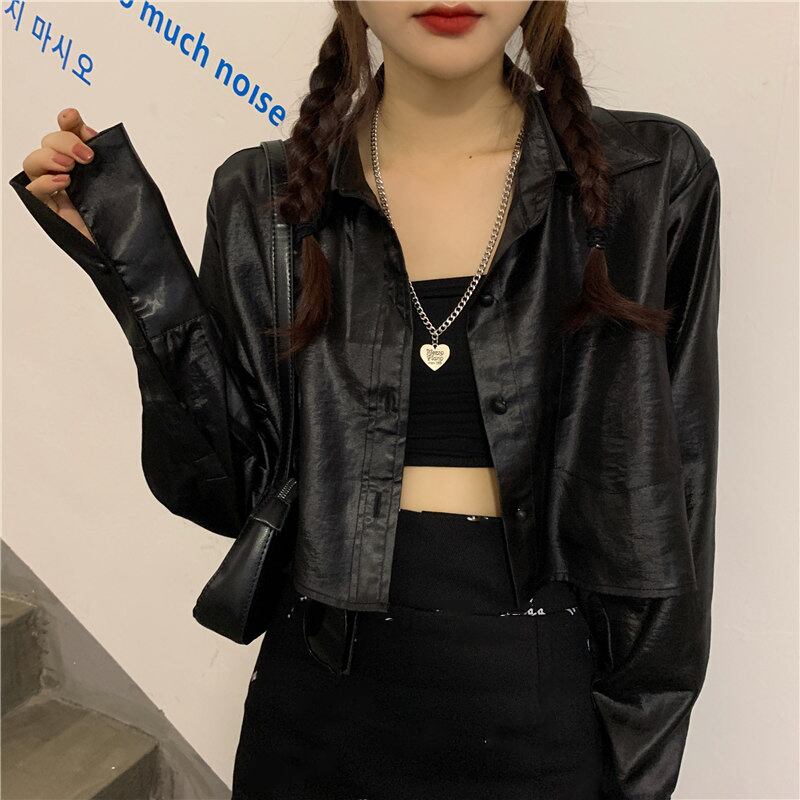 ブラックレザージャケット スプリングオータムショート 春物 秋物 試着室10885835106