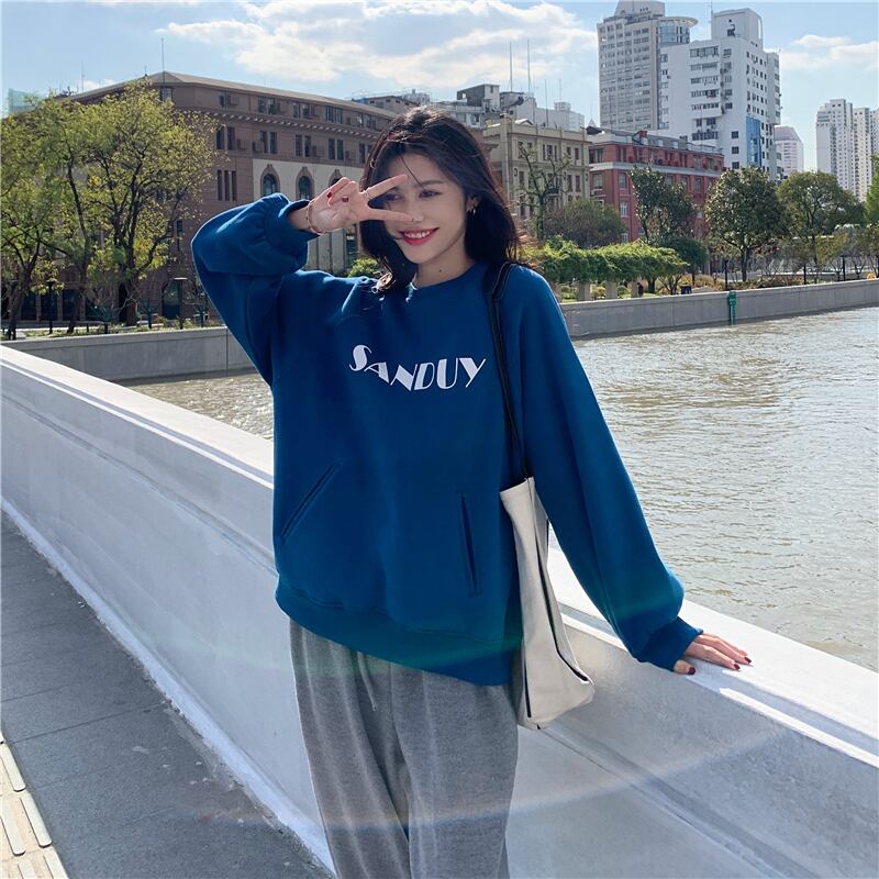 ブルーベルベットセーター スプリングオータムルーズラウンドネック 春物 秋物 Oネック 試着室20839126424