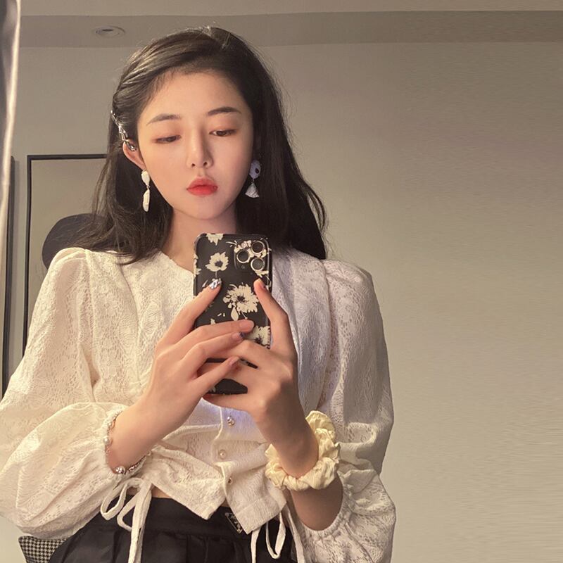 ホワイトシャツ スプリングオータムスタンダードギャザーショートトップス ロング レトロ 春物 秋物 試着室55439638129