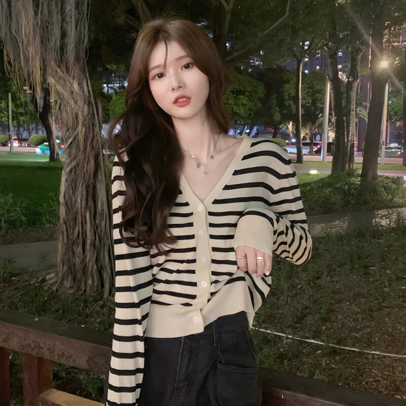 カーディガンスプリングオータムストライプセーター Vネックトップス ロング 春物 秋物 試着室59865843864