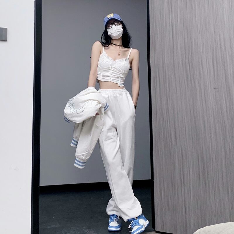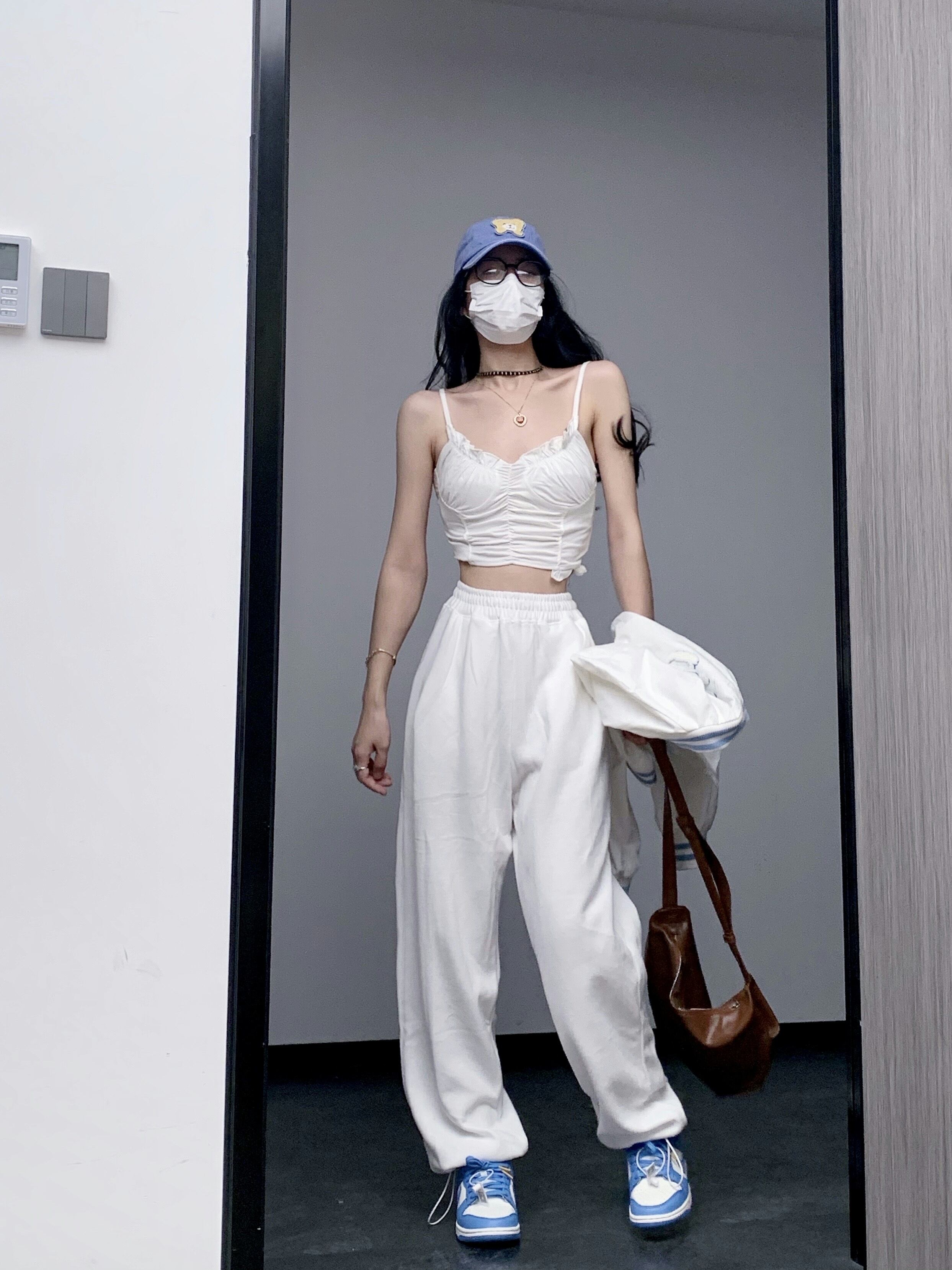 色:ミルクブルーのジャケット一枚,真っ白なスリング1枚,ホワイトカジュアルパンツワンピース