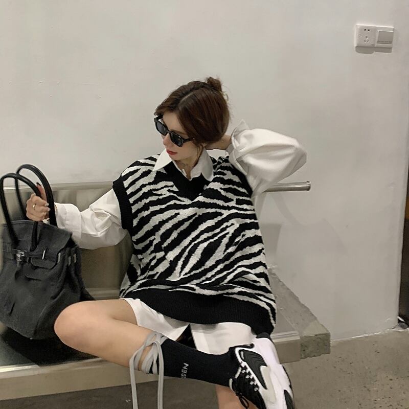 色:白いシャツのワンピース,ゼブラ柄ベスト一枚