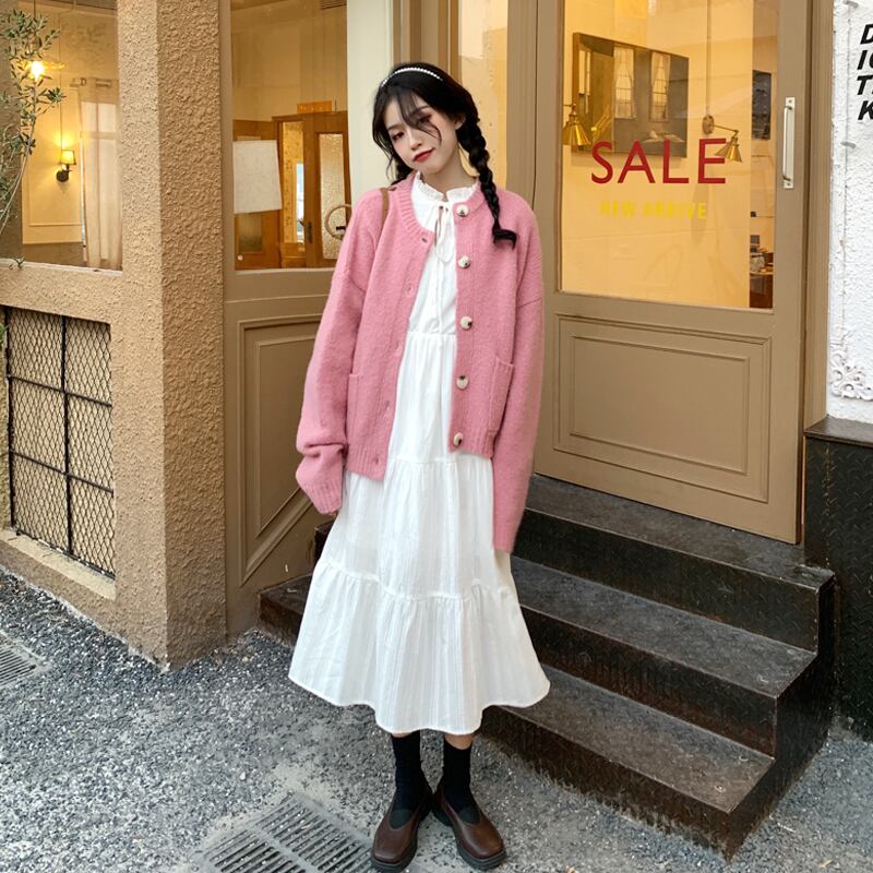 色:ピンクのニットウェアワンピース,白いワンピースのワンピース