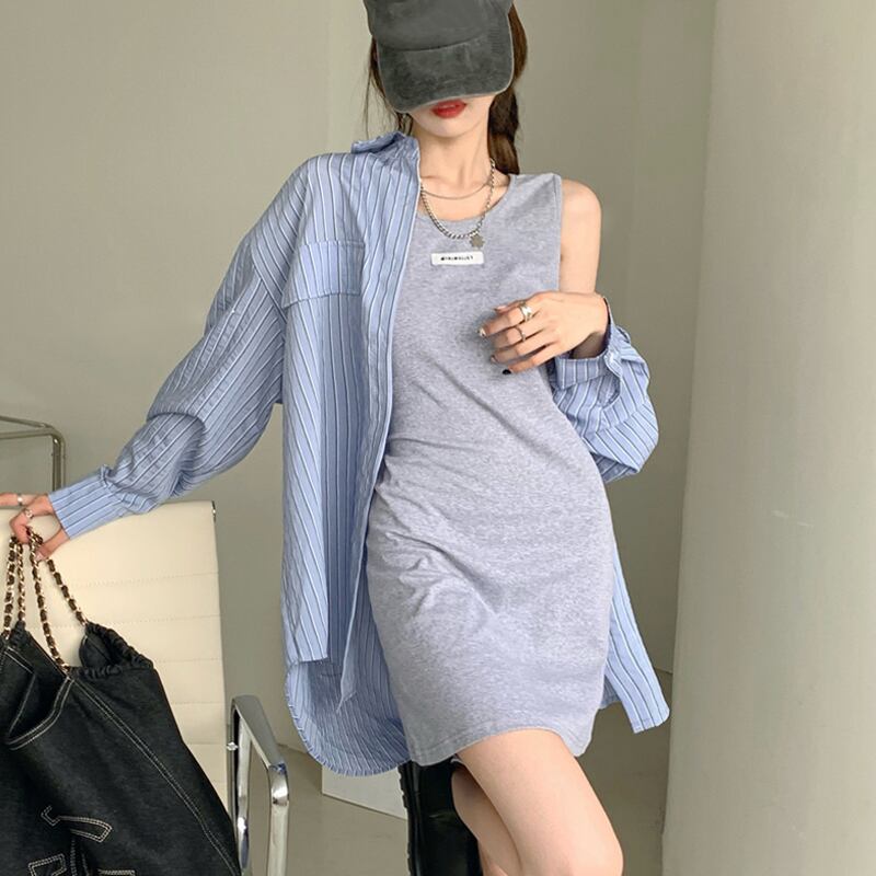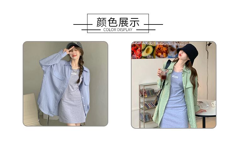 ブルーストライプシャツ ジャケット スプリングオータムスタンダードスタイルトップス レトロ 春物 秋物 試着室19949783573