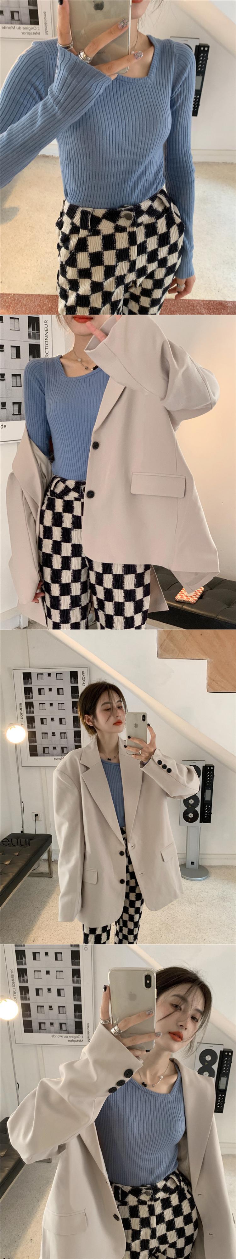 色:ミキシングスーツワンピース,青のニットウェアワンピース,チェッカーボードパンツワンピース