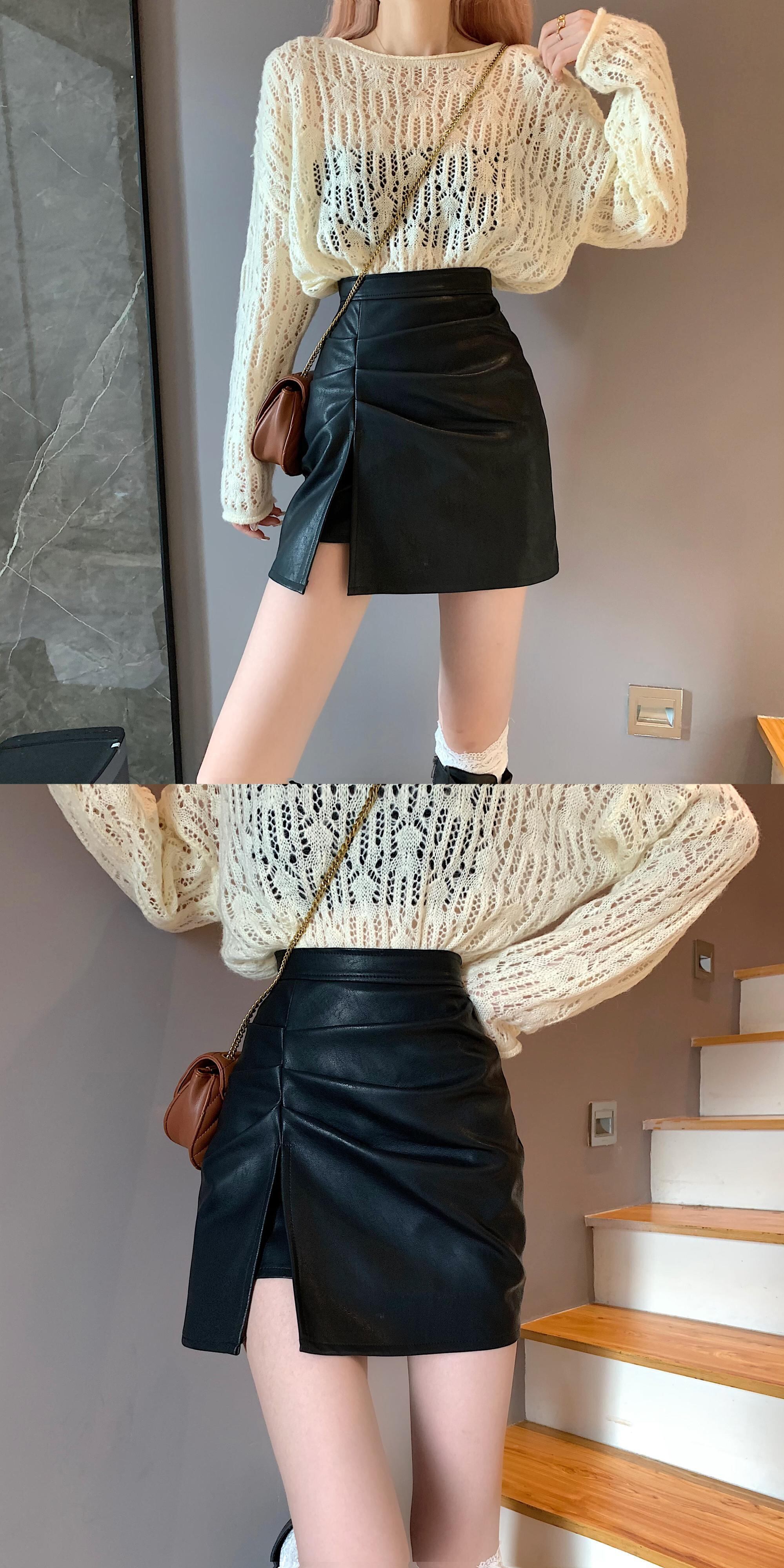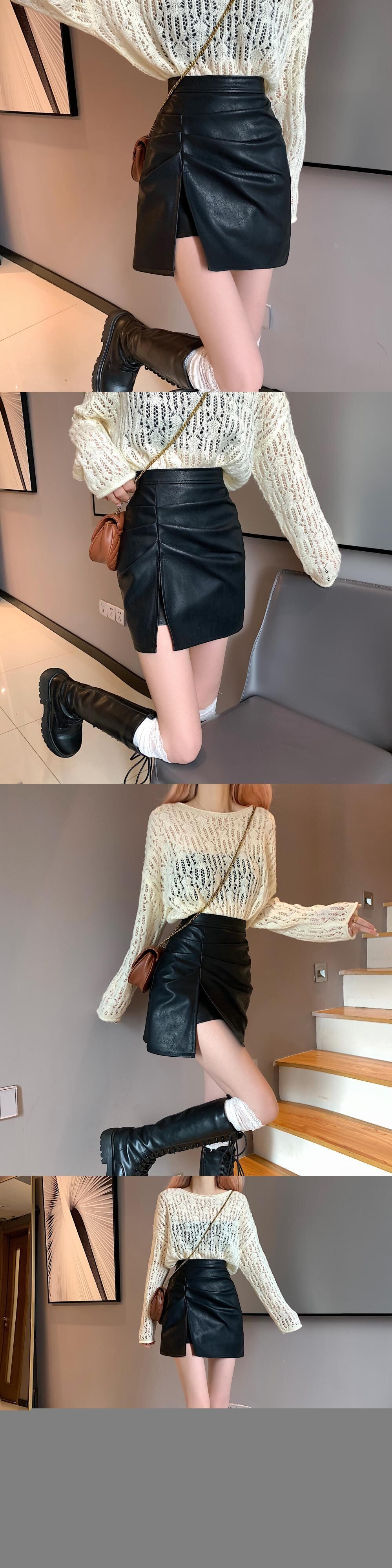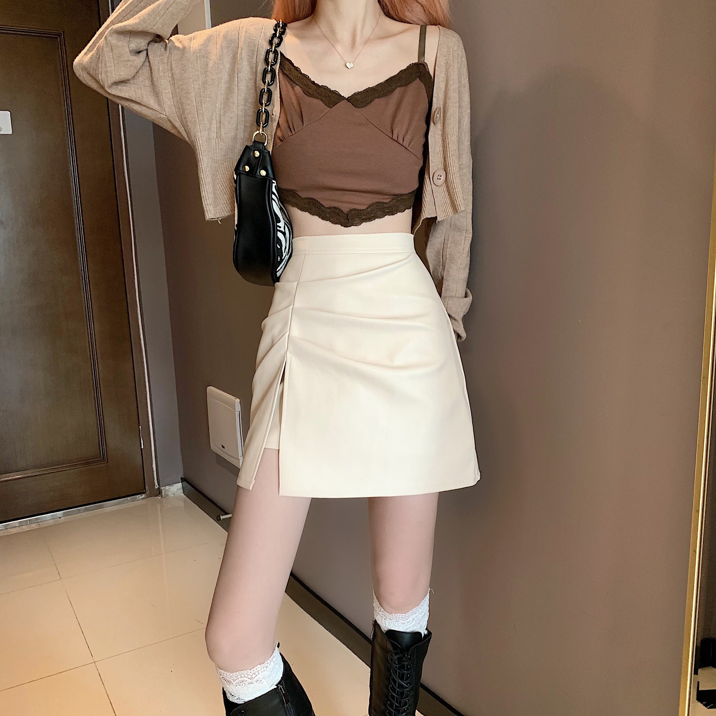 レザースカート スプリングオータムハイウェストウェスト薄手Aラインショート 春物 秋物 試着室44407653665