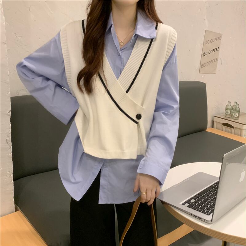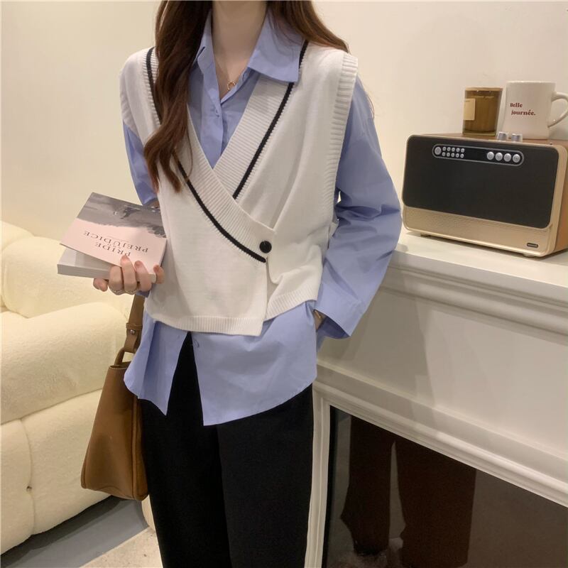 ホワイトVネックニットスプリングオータムシャツショート 春物 秋物 試着室61023014659